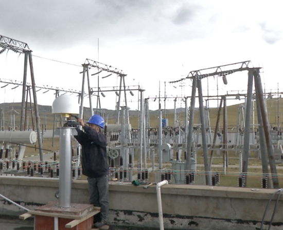 現(xiàn)場工作人員在當雄110KV變電站進行北斗衛(wèi)星接收天線安裝調(diào)試工作。任興旺 攝
