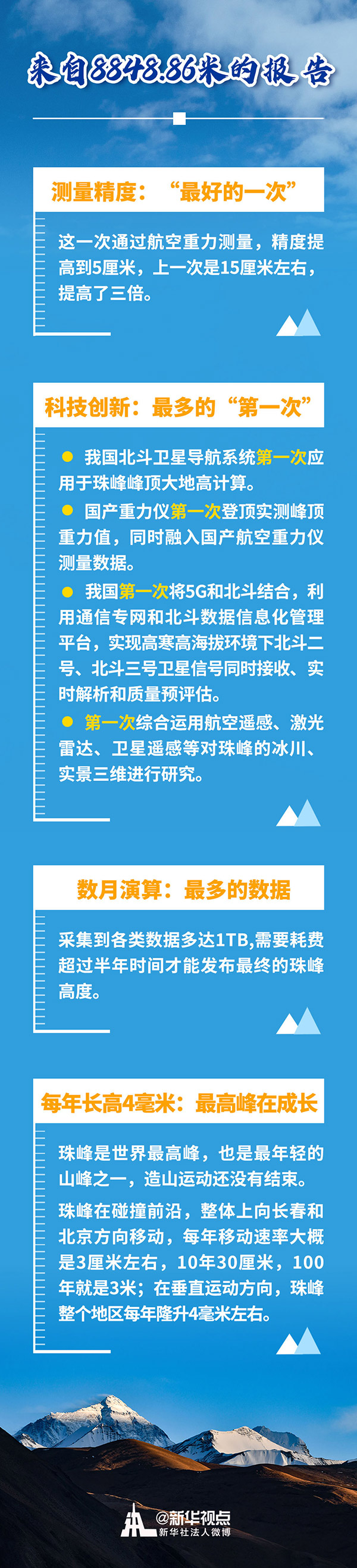 8848.86米:作為世界最高峰的珠穆朗瑪峰最新“身高”8日公布。自然資源部權(quán)威人士說(shuō),同上一次測(cè)量結(jié)果相比,此次測(cè)量數(shù)據(jù)的科學(xué)性、可靠性、創(chuàng)新性,都達(dá)到一個(gè)新高度。
