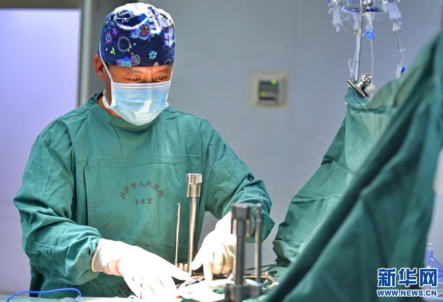 在拉薩市人民醫(yī)院第二手術(shù)室,主治醫(yī)師醫(yī)生扎西云旦為包蟲病患者做手術(shù)(2020年12月31日攝)。新華社記者 張汝鋒 攝
