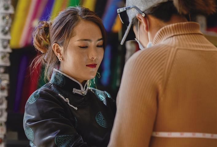 “老板,你家還有這款藏裝嗎?我想要一款。”在該店內(nèi),市民卓嘎拿出手機(jī),指著格桑措姆錄制的藏裝短視頻說(shuō)道。“有的,這是我們今年推出的新款,是對(duì)傳統(tǒng)的藏裝進(jìn)行了改良,主要是體現(xiàn)在領(lǐng)口處,改良后的藏裝對(duì)領(lǐng)口部位進(jìn)行了復(fù)古簡(jiǎn)約化設(shè)計(jì),使其兼具美觀性與舒適性,再搭配一個(gè)‘卡烏’堪稱完美?!备裆4肽方榻B道。