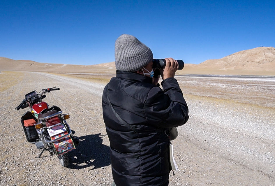 次成塔青拿著望遠(yuǎn)鏡觀察遠(yuǎn)方(2021年2月攝)。 新華社記者 田金文 攝