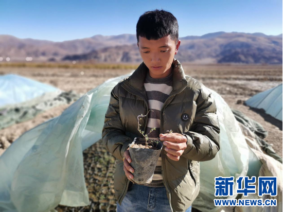 在隆子鎮(zhèn)新巴扶貧苗圃基地,扎西次仁向記者展示沙棘幼苗(2月28日攝)。新華網(wǎng) 殷小燕 攝