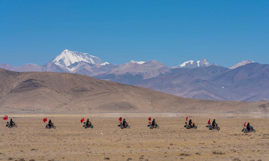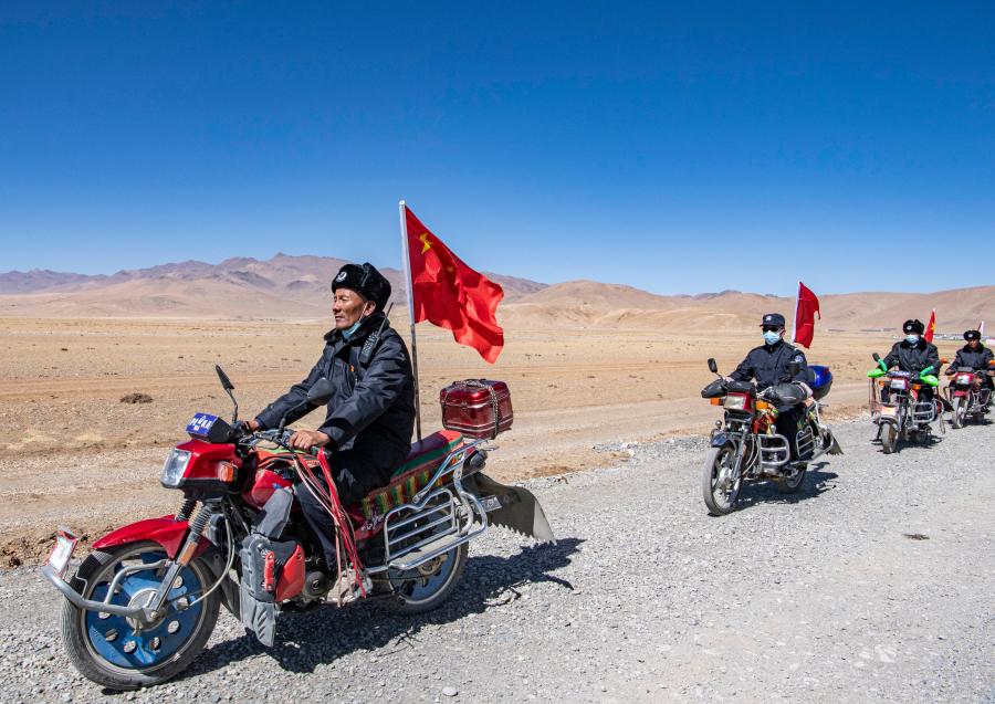 西藏日喀則市薩嘎縣昌果鄉(xiāng)的一處村莊里,48歲的藏族漢子石覺(jué)塔布在風(fēng)中跨上一輛摩托車,向平坦無(wú)垠的高原邊緣騎去。他的車尾插著一面五星紅旗,被風(fēng)吹得獵獵作響,即便駛出很遠(yuǎn),那抹紅色在車輪卷起的煙塵中也依然醒目。
