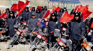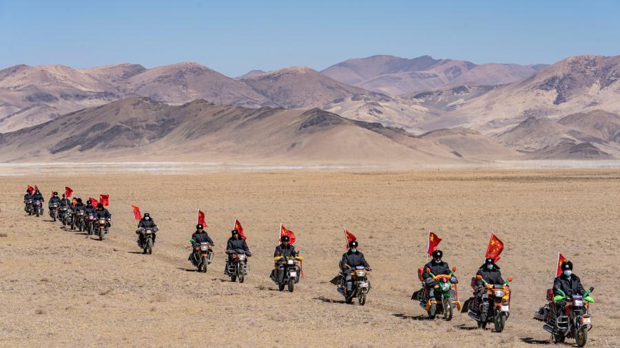 夜幕降臨高原,一天的訓(xùn)練結(jié)束。隊(duì)員們騎著車從鄉(xiāng)里散去,出發(fā)前不忘再緊一緊車尾的國(guó)旗。一輪明月懸在喜馬拉雅山脈的群山上,照亮了守邊人的回家路。