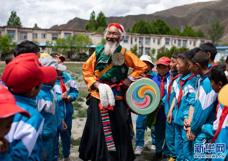 “久河卓舞”傳承人尼瑪(中)在瓊結(jié)縣下水鄉(xiāng)小學(xué)進行教學(xué)表演前的準備工作(2020年7月2日攝)。新華社記者 普布扎西 攝