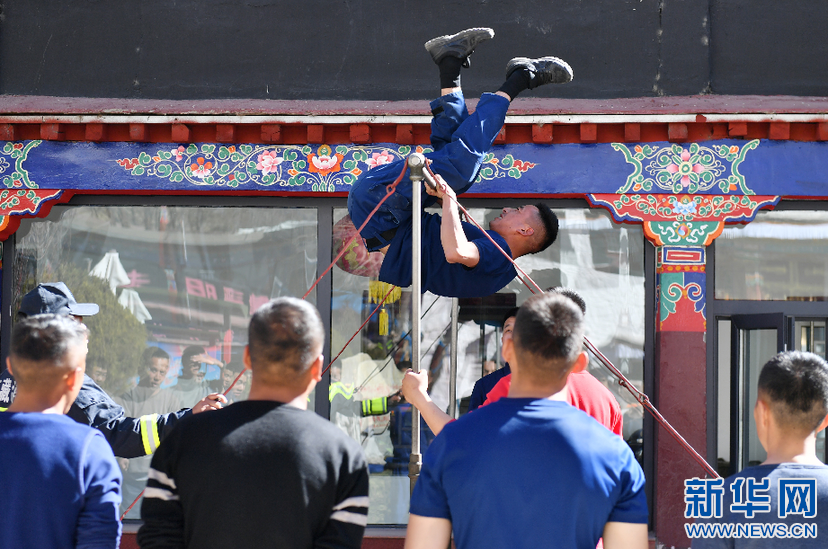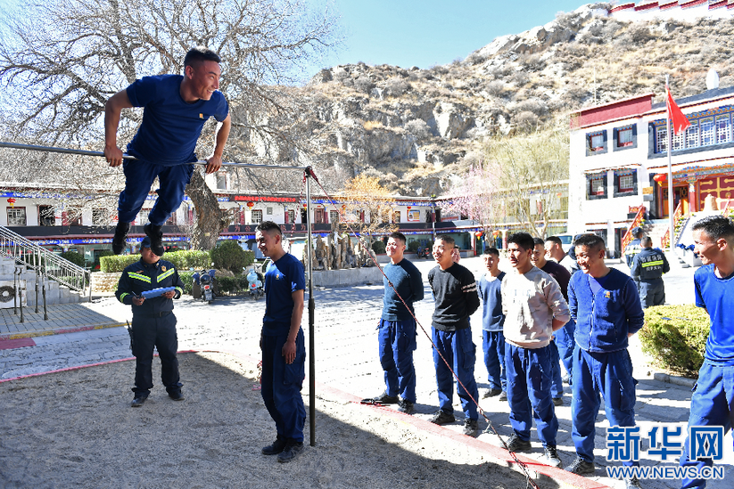 布達拉宮消防救援大隊隊員進行例行體能測試(3月4日攝)。新華社記者 孫瑞博 攝