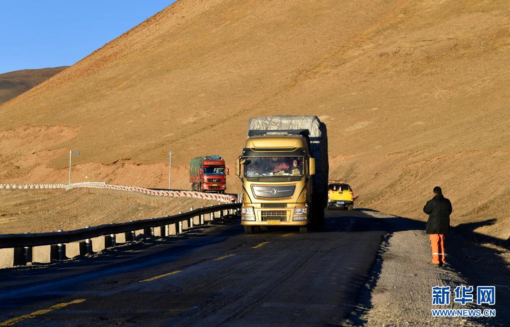 安多公路養(yǎng)護(hù)段巡護(hù)車和一輛貨車行進(jìn)在國(guó)道109唐古拉山口路段(1月13日攝)。新華社記者 張汝鋒 攝
