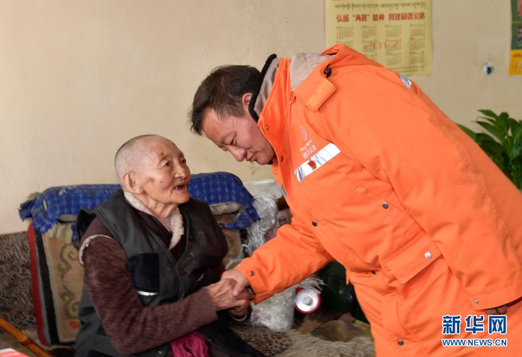 92歲的109道班退休職工瓊措(左)和前來(lái)慰問(wèn)的安多公路養(yǎng)護(hù)段工作人員聊天(1月13日攝)。新華社記者 張汝鋒 攝