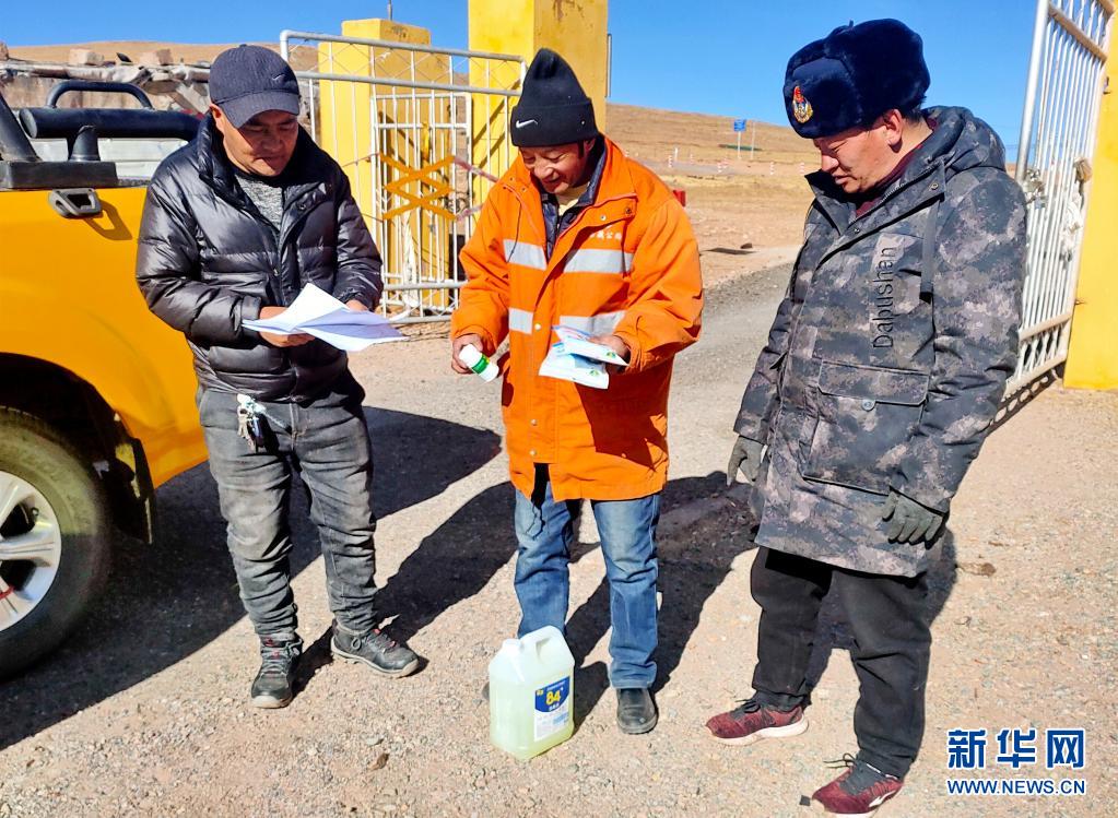 在安多公路養(yǎng)護(hù)段家屬院,扎西次仁(左)和同事準(zhǔn)備為工區(qū)工作人員發(fā)放疫情防控物資(2月8日攝)。新華社發(fā)(斯塔卓瑪 攝)