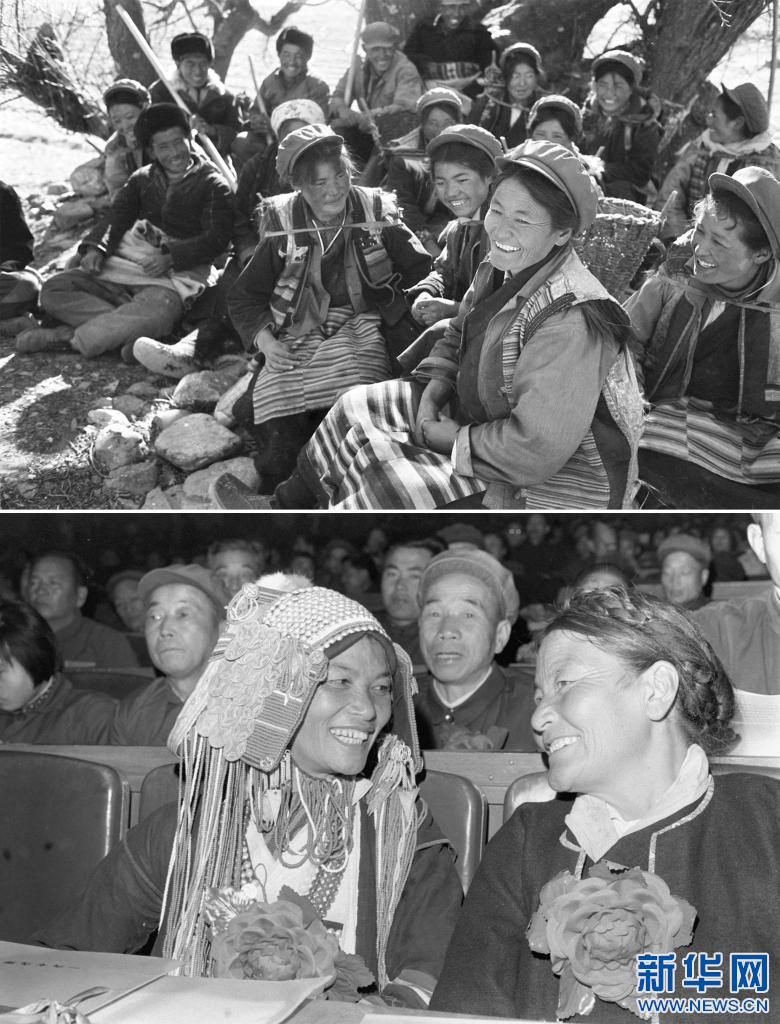 拼版照片:上圖:1978年次仁拉姆(前)勞動休息時和社員交談(新華社資料照片)。下圖:1979年次仁拉姆(右)在全國勞動模范授獎大會上(新華社資料照片)。新華社發(fā)