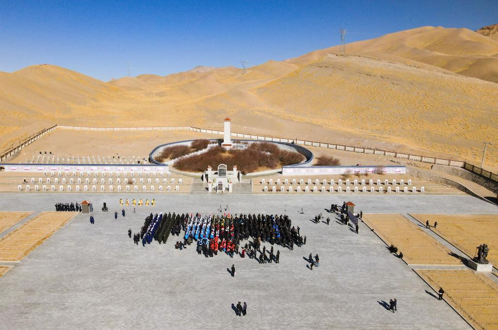 阿里的黨員干部、解放軍、學(xué)生及群眾,聚集在獅泉河烈士陵園里緬懷先烈。(2021年4月4日 新華社記者張兆基 攝 無人機(jī)照片)