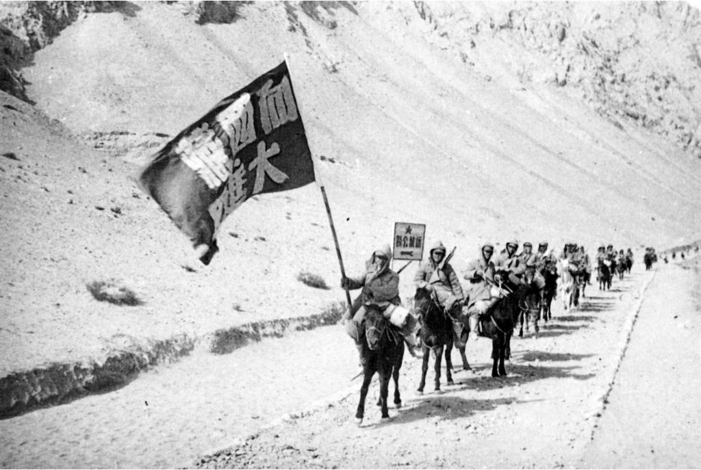 進(jìn)藏先遣連高舉紅旗向西藏阿里進(jìn)軍(執(zhí)旗者為先遣連副連長(zhǎng)彭青云)。進(jìn)藏先遣連紀(jì)念館提供