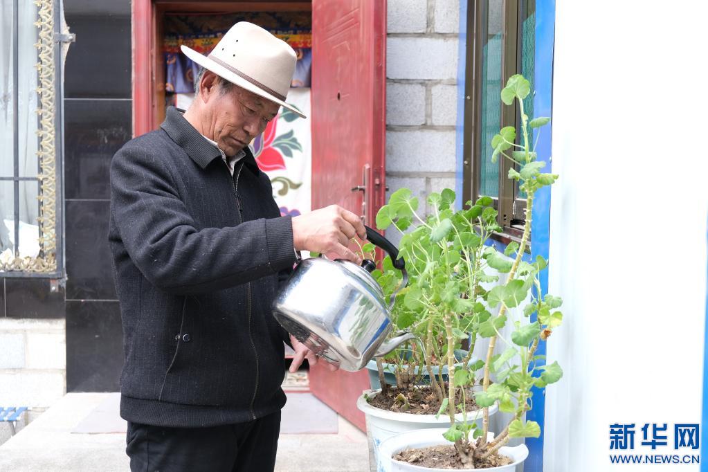金珠給花澆水(3月26日攝)新華社記者格桑邊覺 攝