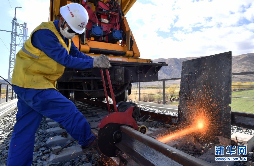 中鐵十一局工人在川藏鐵路拉薩至林芝段進(jìn)行長(zhǎng)鋼軌無(wú)縫焊接作業(yè)(2020年4月16日攝)。新華社記者 覺(jué)果 攝