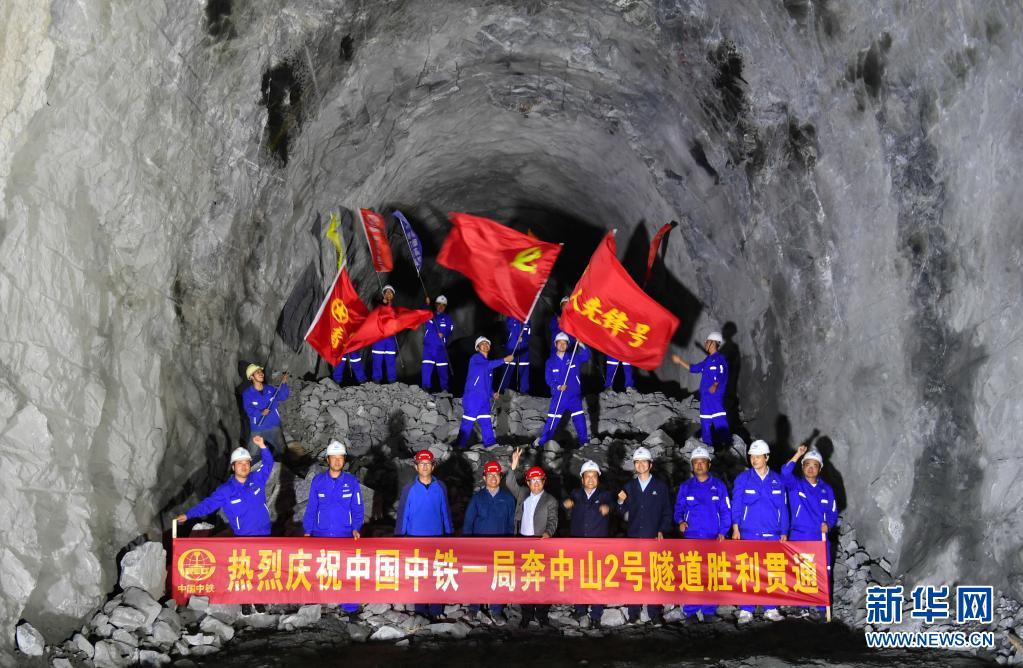 施工人員慶祝川藏鐵路拉林段重難點(diǎn)工程奔中山二號(hào)隧道順利貫通(2018年8月21日攝)。新華社記者 晉美多吉 攝