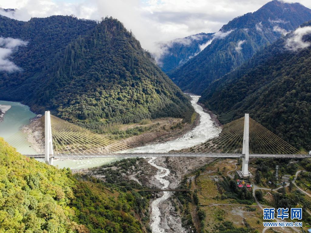 這是西藏林芝境內(nèi)的多布特大橋(2019年10月29日攝,無(wú)人機(jī)照片)。新華社記者 普布扎西 攝
