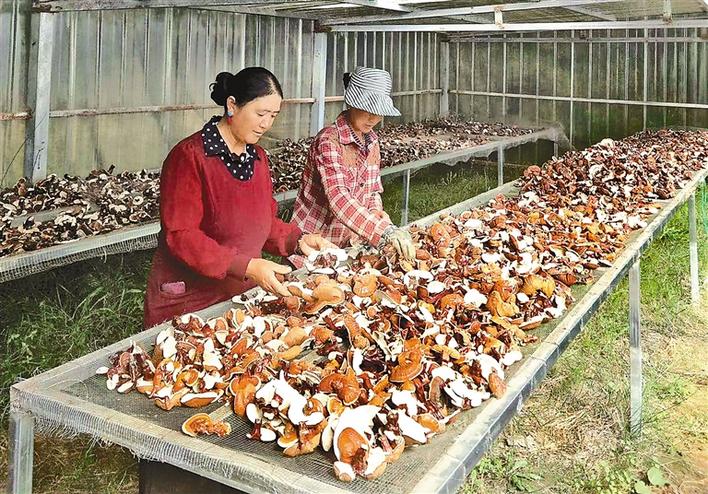 圖為亞登(左)與本村婦女在晾曬靈芝。歐陽海燕 攝