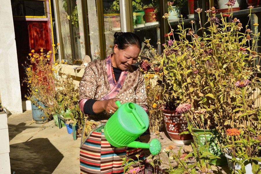 阿里地區(qū)札達縣札布讓村村民金珠德吉在院子里澆花。新華社記者 田金文 攝