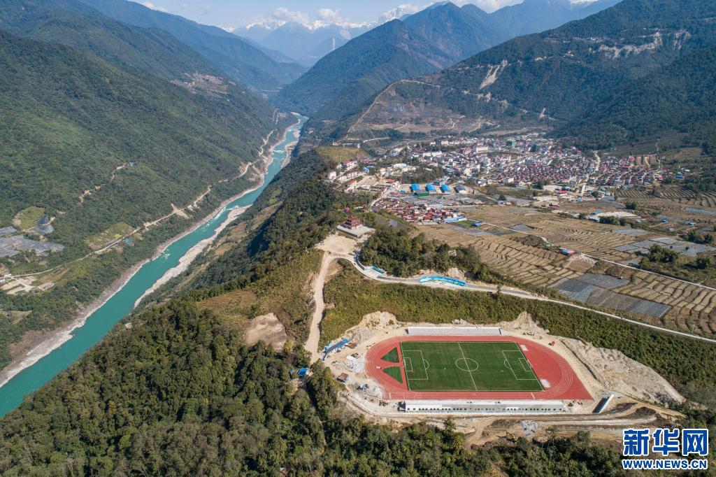 墨脫縣新建的11人制足球場(chǎng)位于雅魯藏布江邊(無人機(jī)照片)。新華社記者孫非攝