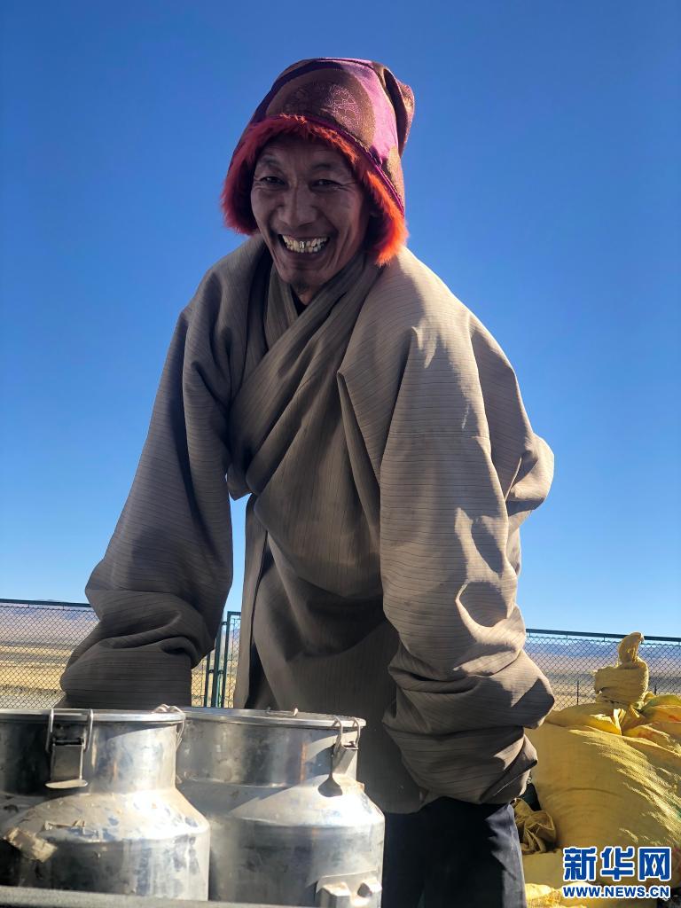 牧民到西藏那曲市嘎?tīng)柕律鷳B(tài)畜牧產(chǎn)業(yè)示范基地賣(mài)牦牛奶(2020年12月13日攝)新華社記者 金一清 攝。