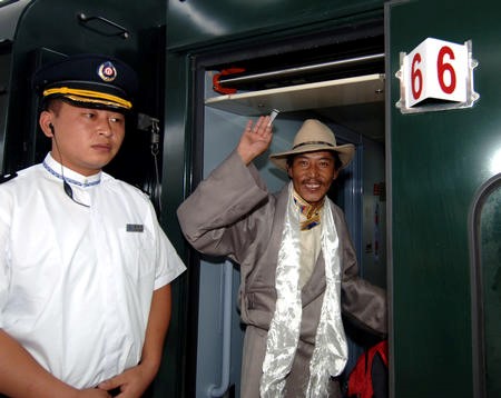 2006年7月1日,第一位檢票登車的乘客——來自拉薩柳梧鄉(xiāng)的達(dá)瓦桑布——登上慶典列車后向站臺(tái)上的人們揮手。