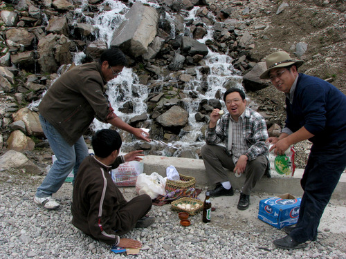 鐘揚(yáng)(右二)與西藏大學(xué)師生在西藏采集種子時在野外用餐。(資料照片)