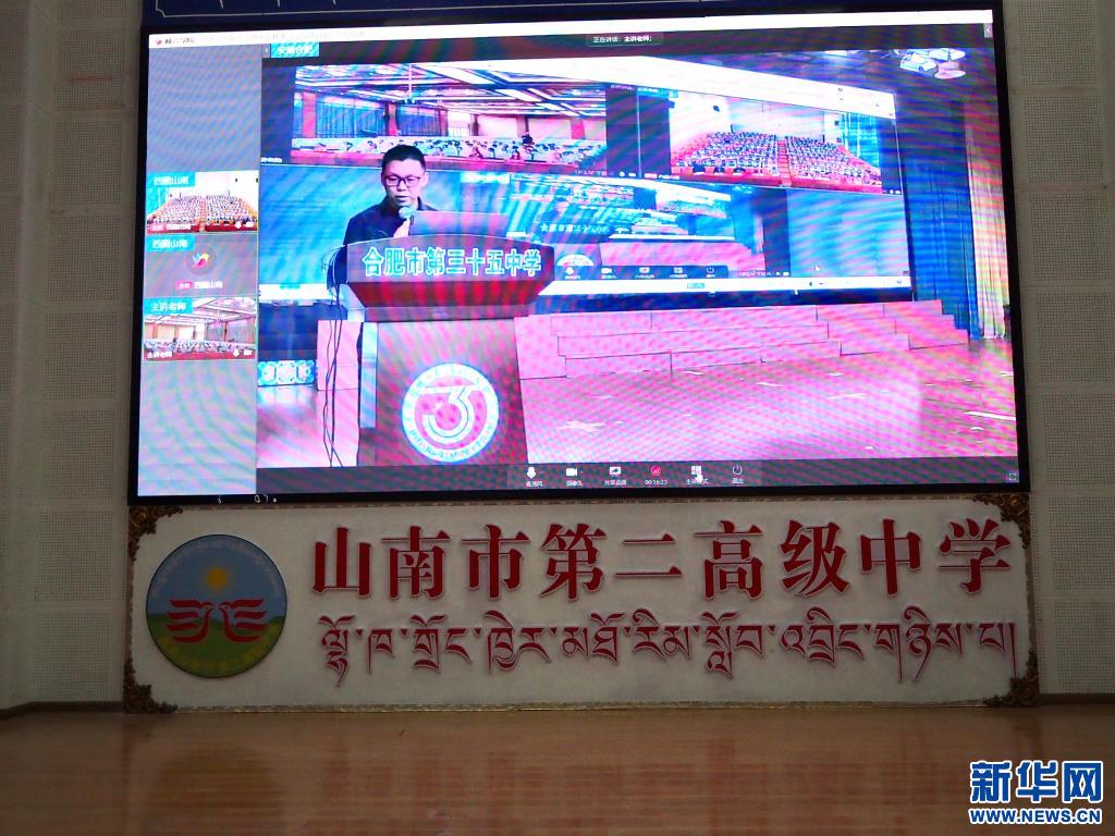 西藏山南市第二高級中學的學生坐在階梯教室中,屏幕的另一端是安徽省合肥市第三十五中學的同學們。借助網(wǎng)絡傳輸技術,皖藏兩地實現(xiàn)思政課教學資源跨越上千公里的互聯(lián)共享,創(chuàng)新了思政課的形式。