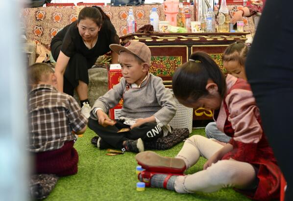 在日喀則市郊區(qū)的一個(gè)度假村,家長(zhǎng)帶孩子在帳篷里“過林卡”(2019年6月23日攝)。新華社記者 張汝鋒 攝