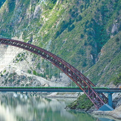 6月21日,拉林鐵路測試車輛通過山南市加查縣的藏木特大橋。記者 徐馭堯攝