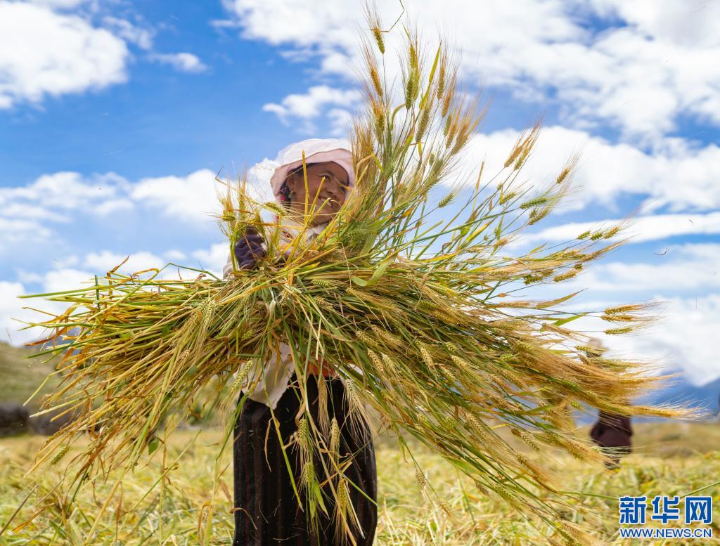 西藏昌都市八宿縣然烏鎮(zhèn)康沙村村民在收青稞(2020年9月10日攝)。新華社記者 普布扎西 攝