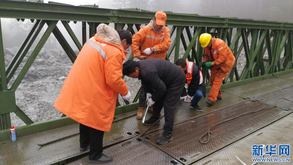 湯剛旦(左)和同事在扎墨公路上執(zhí)行道路養(yǎng)護任務(5月13日攝)。新華社發(fā)