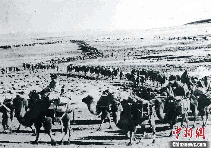 資料圖為1953年11月,西藏運(yùn)輸總隊(duì)駝工往西藏徒步運(yùn)輸物資。 中新社發(fā) 莫河駱駝場(chǎng)歷史陳列館 供圖