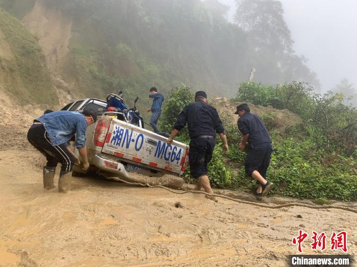 圖為背崩邊境派出所民警對被困車輛進行救援。背崩邊境派出所供圖