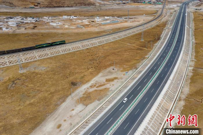 圖為一列進(jìn)藏火車經(jīng)過(guò)G6京藏高速西藏羊八井路段?!〗w波 攝