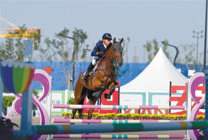 西藏自治區(qū)選手在進行馬術(shù)三項賽團體賽的最后一項比賽場地障礙賽。