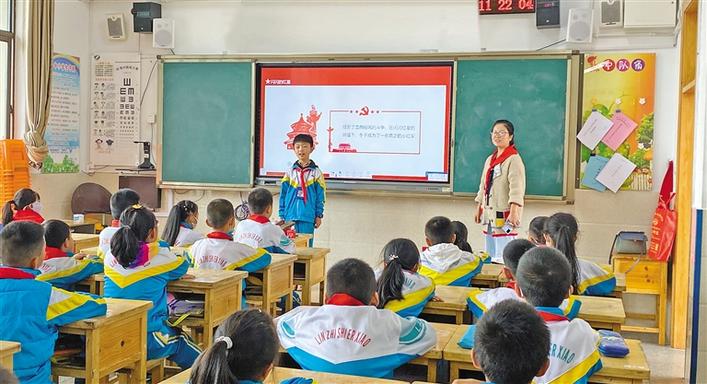 圖為林芝市第二小學(xué)的少先隊員向同學(xué)們講述紅色故事。記者 張猛 攝