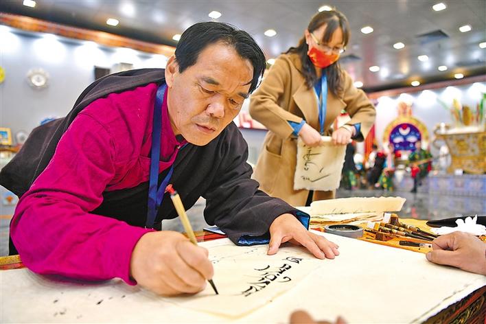 圖為非遺傳承人展示藏文書法。記者 旦增西旦 攝