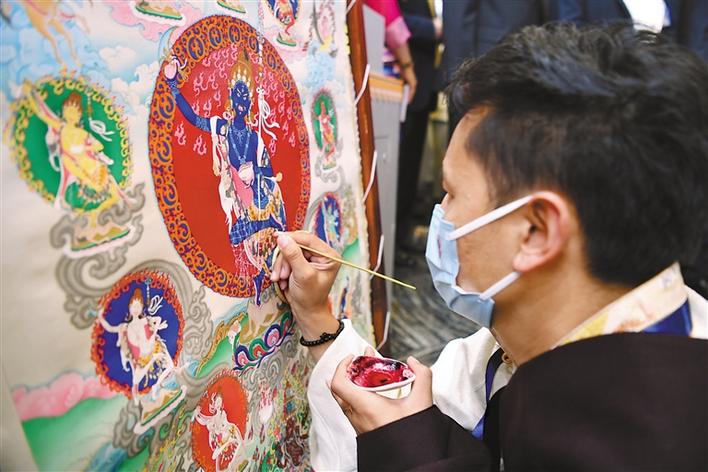 圖為非遺傳承人展示唐卡繪制技藝。記者 旦增西旦 攝