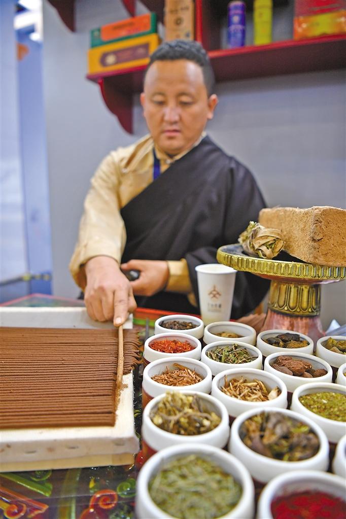 圖為非遺傳承人展示藏香制作過程。記者 旦增西旦 攝
