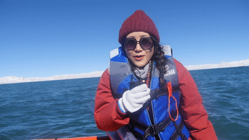 說(shuō)不害怕那是假的,我時(shí)刻準(zhǔn)備著被大浪拍進(jìn)湖里去。心里想著,反正有救生衣,就算真掉湖里了,也不至于淹死吧,頂多冷點(diǎn)兒!后來(lái),我把這個(gè)想法告訴同行的專(zhuān)家時(shí),他們搖著頭說(shuō),真掉下去可不得了。這個(gè)氣溫可是會(huì)凍死人的。
