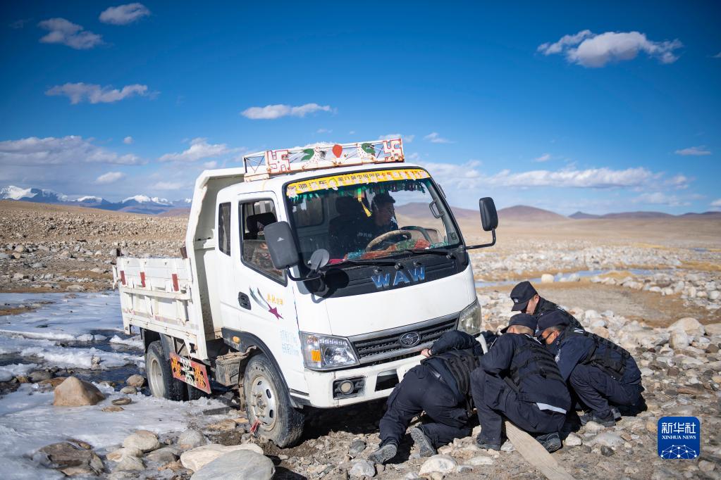 普瑪江塘邊境派出所的移民管理警察在巡邏途中協(xié)助牧民旦增多杰一家拖拽“罷工”的小貨車(11月20日攝)。新華社記者 孫非 攝