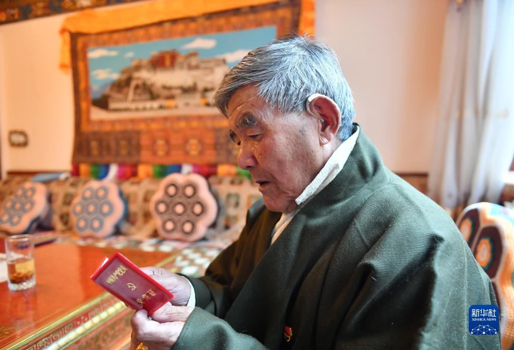 土丹堅參老人在翻看自己的黨費證(5月11日攝)。新華社記者 孫瑞博 攝