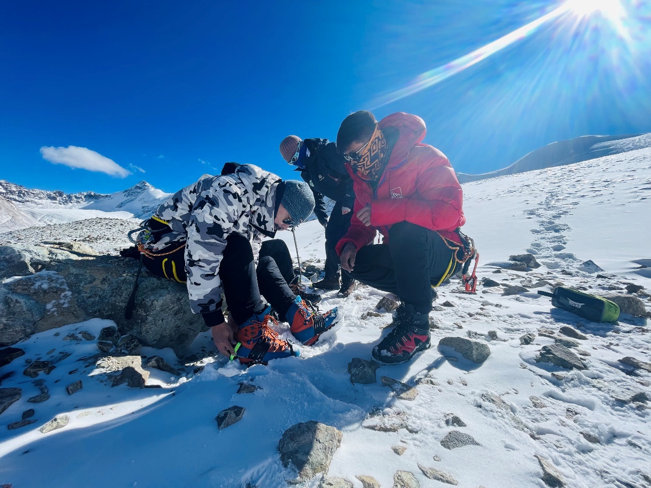 抵達洛堆峰5600米雪線的位置,三位二十歲出頭的年輕人熟練地在積雪冰壁上打起冰錐,固定路繩,他們在給這些遠道而來的體驗者設(shè)置技能訓練路線。