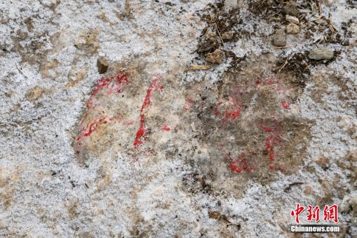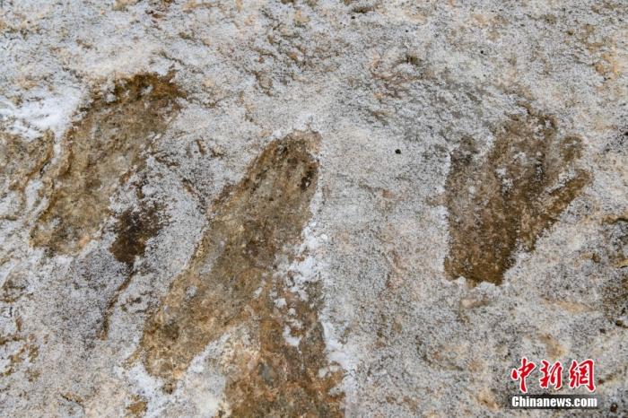 圖為1月19日拍攝的西藏拉薩市堆龍德慶區(qū)德慶鄉(xiāng)邱桑村邱桑溫泉石灰?guī)r上的“古人類(lèi)手腳印”。中新社記者 貢嘎來(lái)松 攝