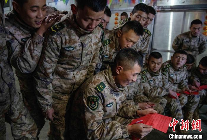 聯(lián)歡的尾聲指導(dǎo)員夏邦國拿著最后的彩袋走到臺(tái)前,把晚會(huì)推向高潮,“兄弟們,這還有一大袋紅包,里面裝著的可是最珍貴的祝福”。官兵們用抽盲盒的形式拆開新年的“紅包”。中士趙路寬抽到一個(gè)最鼓的,打開是滿滿的糖果;下士吳兵拆開的是一個(gè)帶有小機(jī)關(guān)的新年賀卡;下士鄧云川拆到一封遠(yuǎn)方的匿名信,“雖不曾相見與相識(shí),但知道是你們在默默堅(jiān)守付出,守衛(wèi)著祖國的雪域邊防”。伴隨著他磕絆的普通話,連隊(duì)官兵漸漸安靜下來?!斑呹P(guān)有我,請(qǐng)祖國和人民放心”,簡易投影的大屏上開始播放著官兵們一年多來頂風(fēng)冒雪,戰(zhàn)天斗地的光影片段,在這大山里的多少的苦累酸甜,都已經(jīng)鐫刻在茫茫雪域。