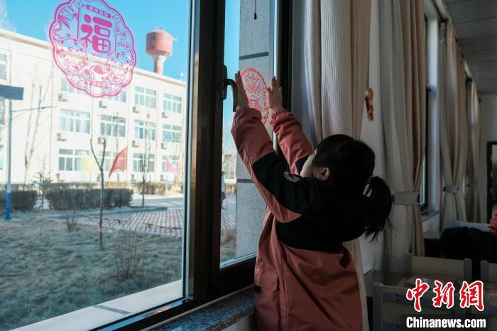 圖為戍邊民警的孩子在貼新年窗花?!〗w波 攝