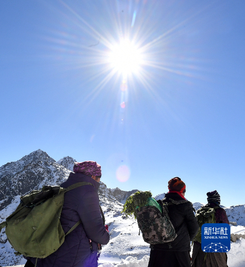 三位老阿媽走在前往哨所送菜的路上(1月27日攝)。新華社記者 覺果 攝