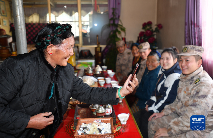 云南省楚雄彝族自治州的軍屬普曉虹寒假期間跟隨官兵到三位老阿媽家里走訪,她在和云南老家父母視頻通話時(shí)說:“爸媽,我在西藏有了三個(gè)阿媽!”(1月26日攝)。新華社記者 覺果 攝