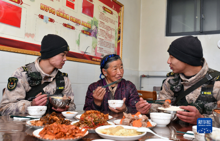 次仁曲珍老人在哨所與戰(zhàn)士一起吃飯時(shí),講述過去送菜的經(jīng)歷(1月27日攝)。新華社記者 覺果 攝