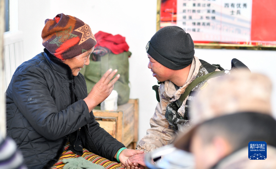 老阿媽達(dá)吉在和戰(zhàn)士聊家常(1月27日攝)。新華社記者 覺果 攝